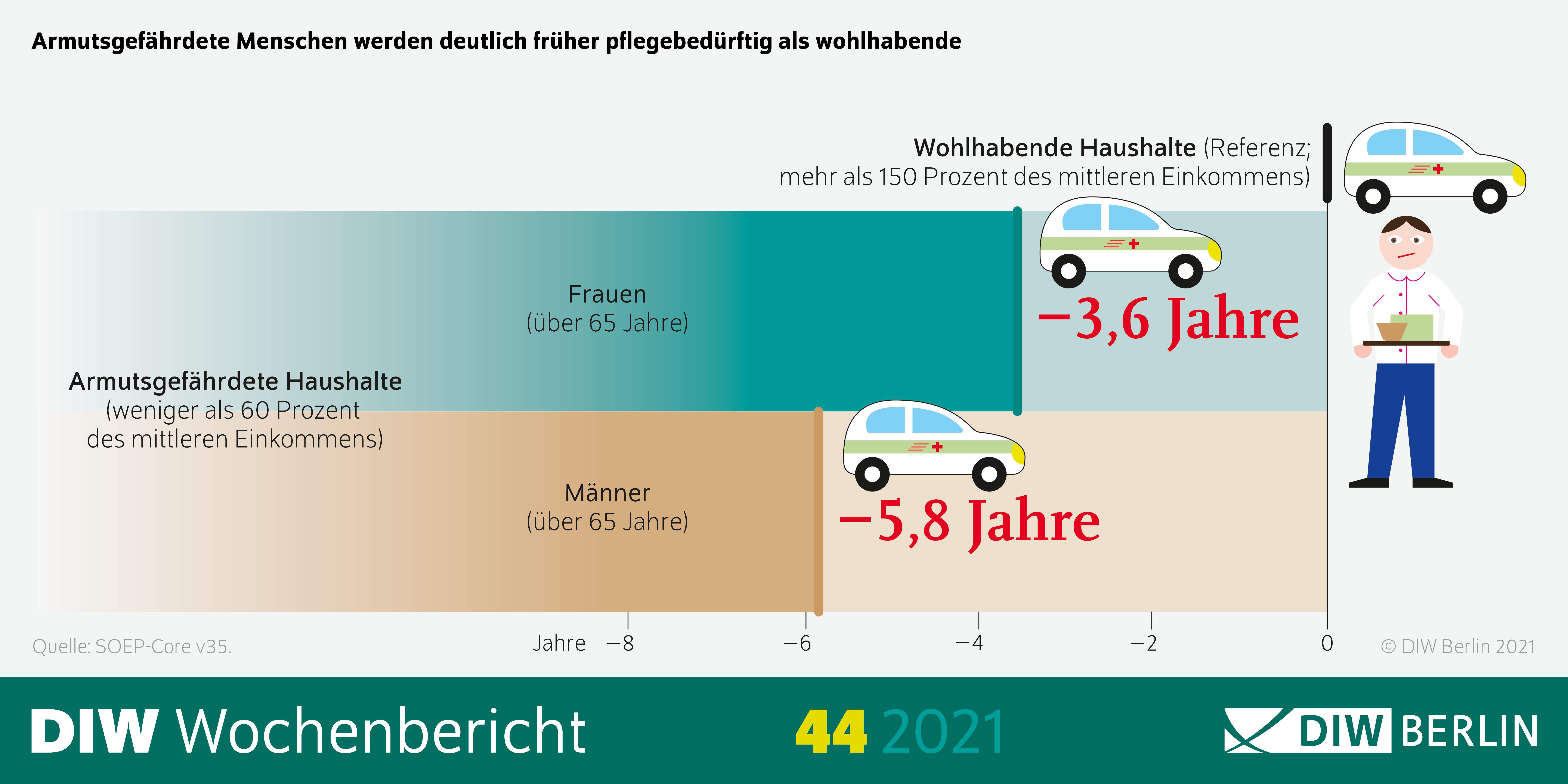Frühere Untersuchungen hatten gezeigt, dass Menschen mit niedrigen Einkommen zudem eine deutlich geringere Lebenserwartung als Besserverdienende haben. „Nicht nur Einkommen und Lebenserwartung sind in Deutschland sozial ungleich verteilt, sondern auch das Pflegerisiko“, stellt Peter Haan, Leiter der Abteilung Staat am DIW Berlin, fest. Für die aktuelle Analyse hat er mit seinen DIW-Kollegen Johannes Geyer, Hannes Kröger und Maximilian Schaller Daten des Sozio-oekonomischen Panels (SOEP) ausgewertet.