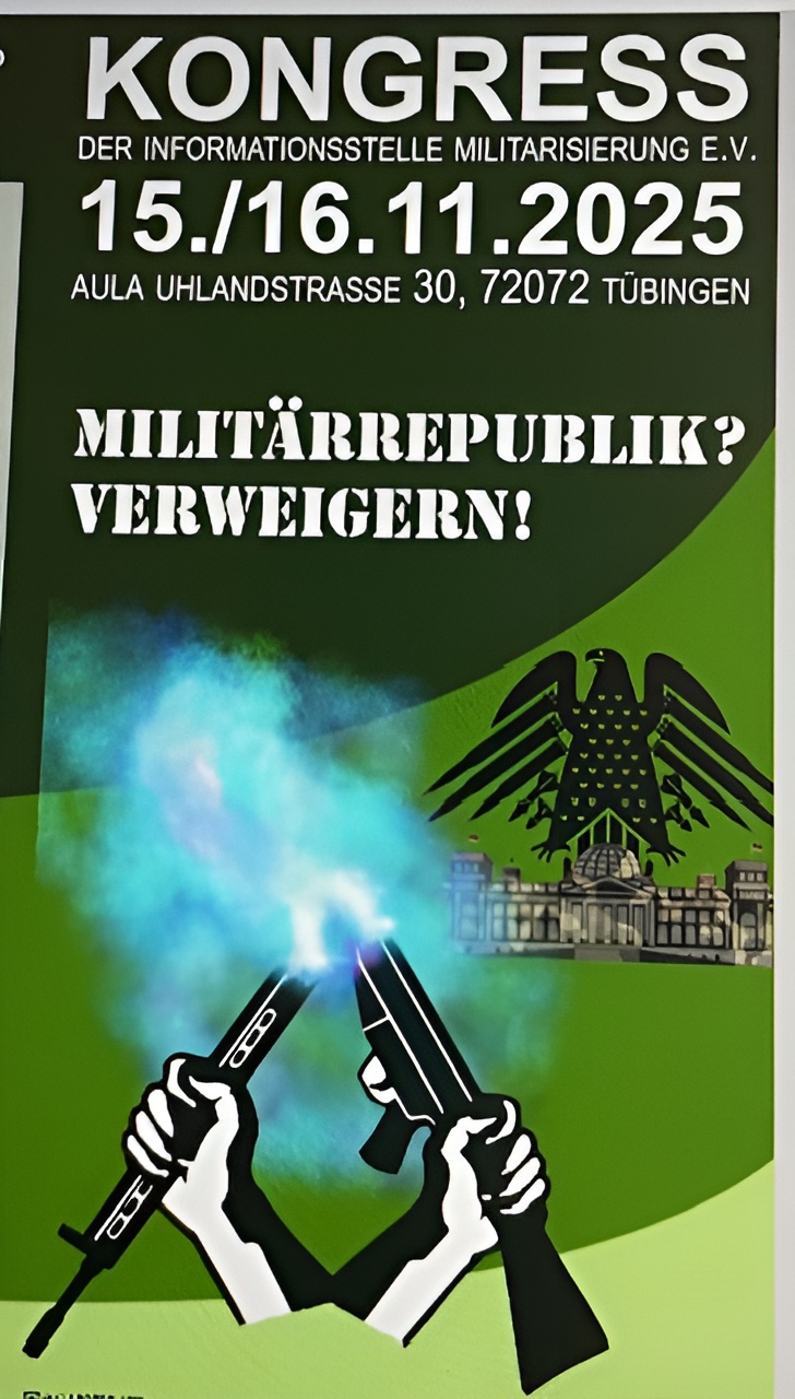 Mit dieser Mail möchten wir Euch noch einmal herzlich zum IMI-Kongress „Militärrepublik! Verweigern!“ am kommenden Wochenende 15./16. November (Mensa, Uhlandstrasse 30, Tübingen) einladen. Wer gemütlich anreisen möchte, kann gerne schon Freitag das Angebot für die gemütliche Auftaktveranstaltung mit KüFa, Quiz und anderem nutzen (Achtung, anderer Ort: Schellingstr. 6).